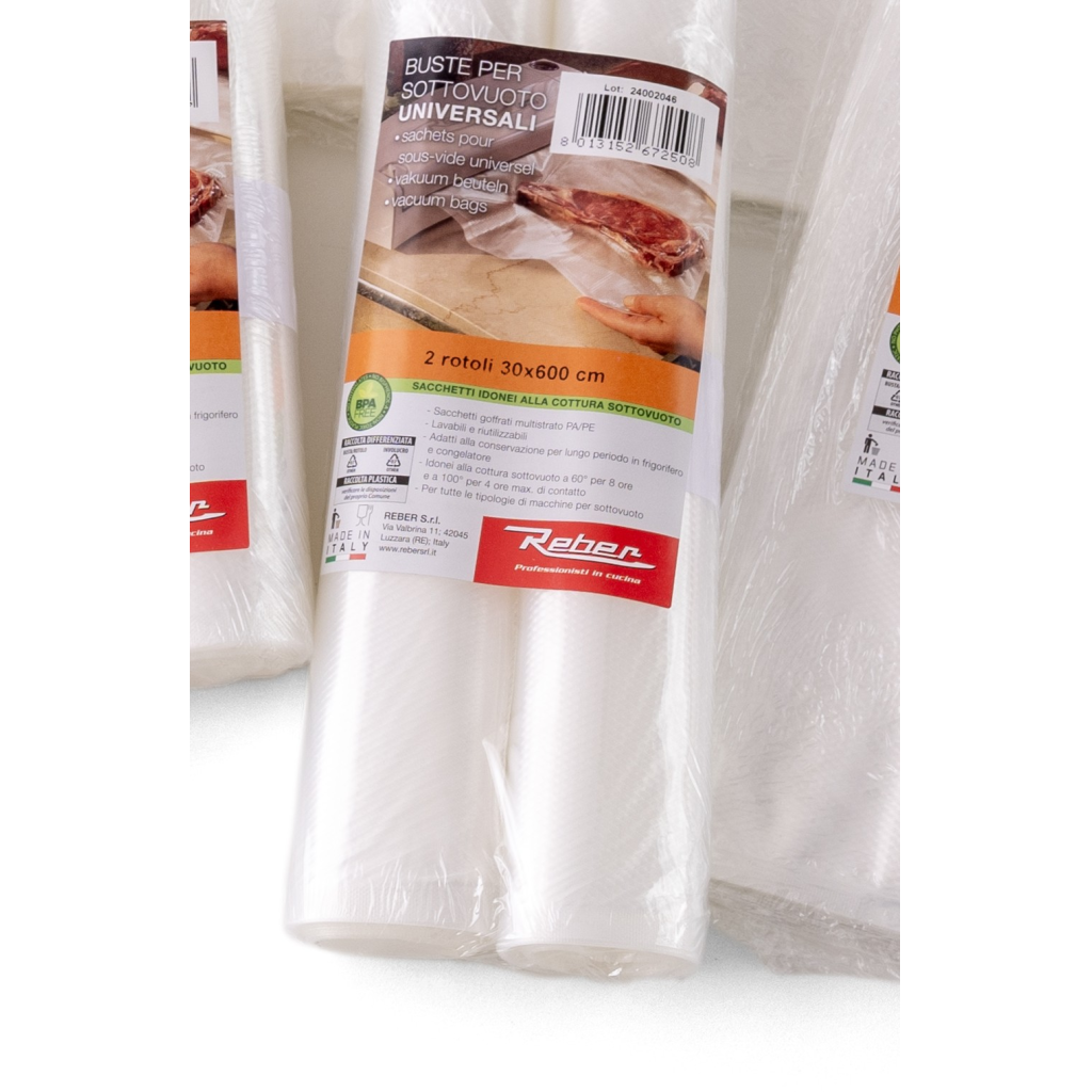 Le buste per sottovuoto devono essere resistenti, impermeabili all’aria e idonee al contatto con gli alimenti. I sacchetti multistrato REBER rispondono a tutti questi requisiti: l’interno in polietilene è idoneo al contatto con l’alimento contenuto; lo strato esterno in poliammide garantisce la tenuta alla penetrazione dell’aria; lo strato centrale, ancora in polietilene, rende il sacchetto più resistente alla perforazione o lacerazione, impedendo la penetrazione dell’umidità, riduce la formazione di brina e cristalli di ghiaccio in congelatore. Le buste goffrate sono adatte anche alla cottura in sottovuoto a bassa temperatura. Disponibili in buste pretagliate o rotoli personalizzabili. Disponibili in varie versioni: PA/PE goffrato standard, PA/PE liscio (per macchine a campana), buste per cottura, buste riciclabili NEXTFLEX.